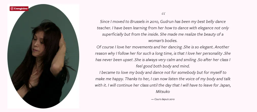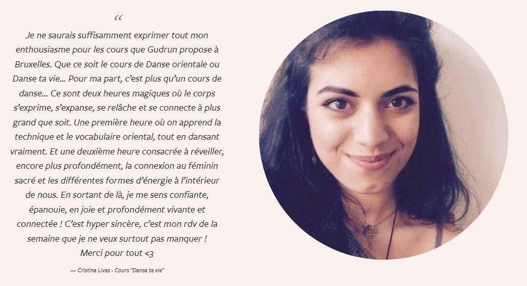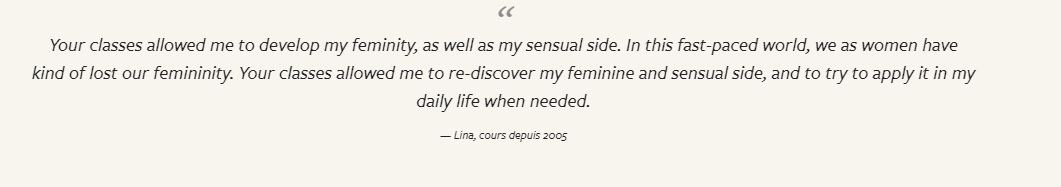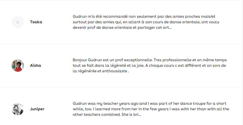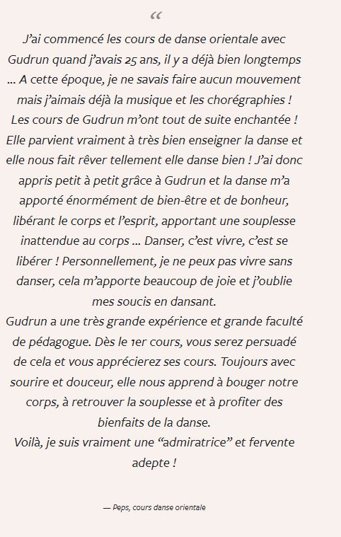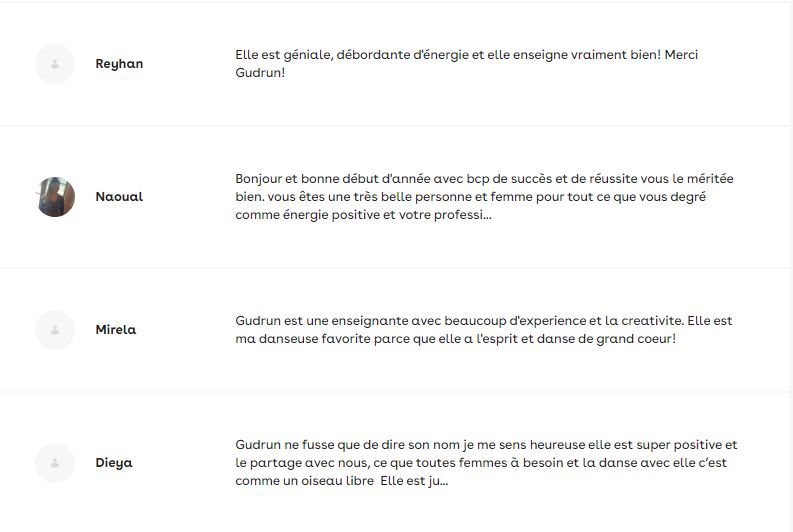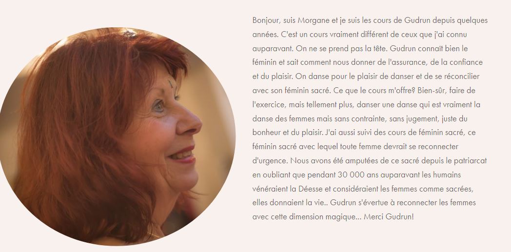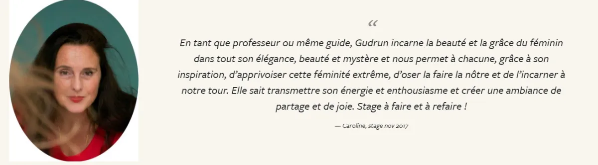 "En tant que professeur ou même guide, Gudrun incarne la beauté et la grâce du féminin dans tout son élégance, beauté et mystère et nous permet à chacune, grâce à son inspiration, d’apprivoiser cette féminité extrême, d’oser la faire la nôtre et de l’incarner à notre tour. Elle sait transmettre son énergie et enthousiasme et créer une ambiance de partage et de joie. Stage à faire et à refaire !"- Caroline, traductrice