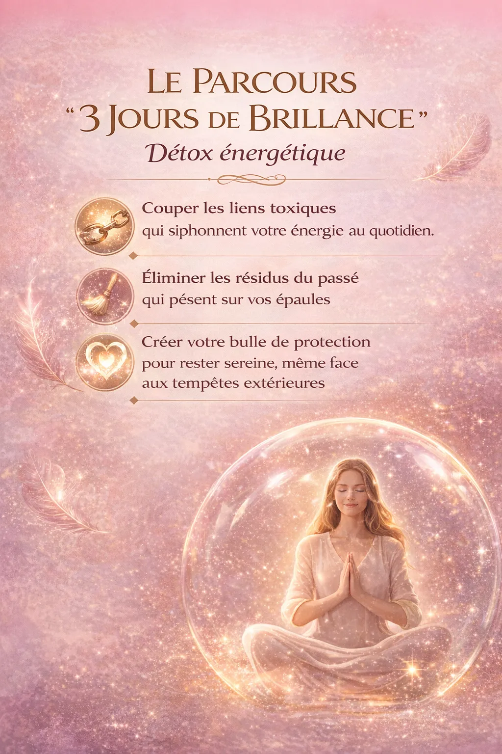 Le Parcours '3 Jours Brillance' : Un nettoyage énergétique express pour couper les liens toxiques dès votre arrivée.